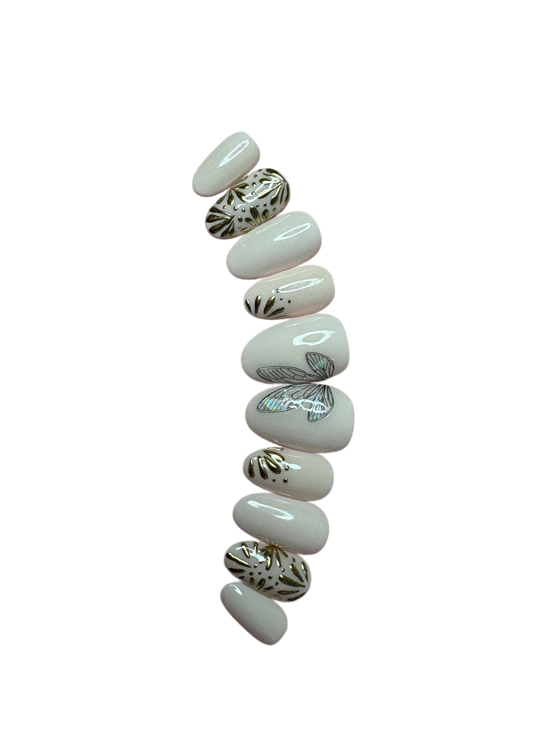 Each nail is carefully designed to balance minimalism and detail, with clean ivory nails offset by feature nails showcasing fine butterfly wings and hand-drawn gold foliage. The glossy finish catches the light beautifully without overpowering your overall look, making this set perfect for brides, bridesmaids, events, or anyone who loves feminine, floral-inspired nails.